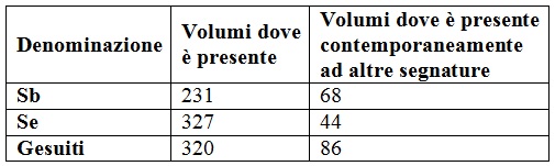 Tre segnature si ripetono in maniera consistente: “Sb”, “Se” e quella riconducibile al fondo “Gesuiti”. Tutte le altre segnature, in modo particolare le più antiche, sono state riscontrate in numero molto inferiore se non una sola volta.