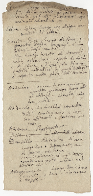Gli interessi di studio del Manera furono diversi e ciò si rispecchia anche nei suoi manoscritti, a dimostrare una preparazione culturale molto ampia, che non a caso era uno dei tratti più apprezzati della sua personalità. Se si escludono appunti di argomento teologico, presenti in molti manoscritti nella forma di citazioni da padri della chiesa brevemente commentate, il tema più trattato è senza dubbio quello della lingua italiana, questione cardine nel confronto erudito liberale di quegli anni e di forte pregnanza identitaria in chiave nazionalistica, in linea con quella serie di dibattiti che precedettero e diedero un preciso carattere culturale al Risorgimento italiano (11). Nei manoscritti di Manera conservati presso l’APUG (12) troviamo infatti appuntate, in modo quasi ossessivo, migliaia (forse decine di migliaia) di parole accompagnate dall’indicazione del dialetto in cui venivano usate, dal relativo significato, da un esempio sul loro uso e infine da uno stringato commento che ne sentenziava il grado di correttezza. Alla luce di ciò, questi manoscritti rappresentano oggi una fonte totalmente inedita di informazioni per il dibattito sulla questione della lingua, una fonte però di difficile interpretazione visto il disordine e la casualità con cui è stata compilata: spesso gli appunti sono infatti sovrascritti sul testo di lettere ricevute dal Manera, oppure in fogli rozzamente ritagliati o, ancora, mischiati con altri appunti di argomento diverso, per cui venirne a capo risulta davvero un arduo compito (13).