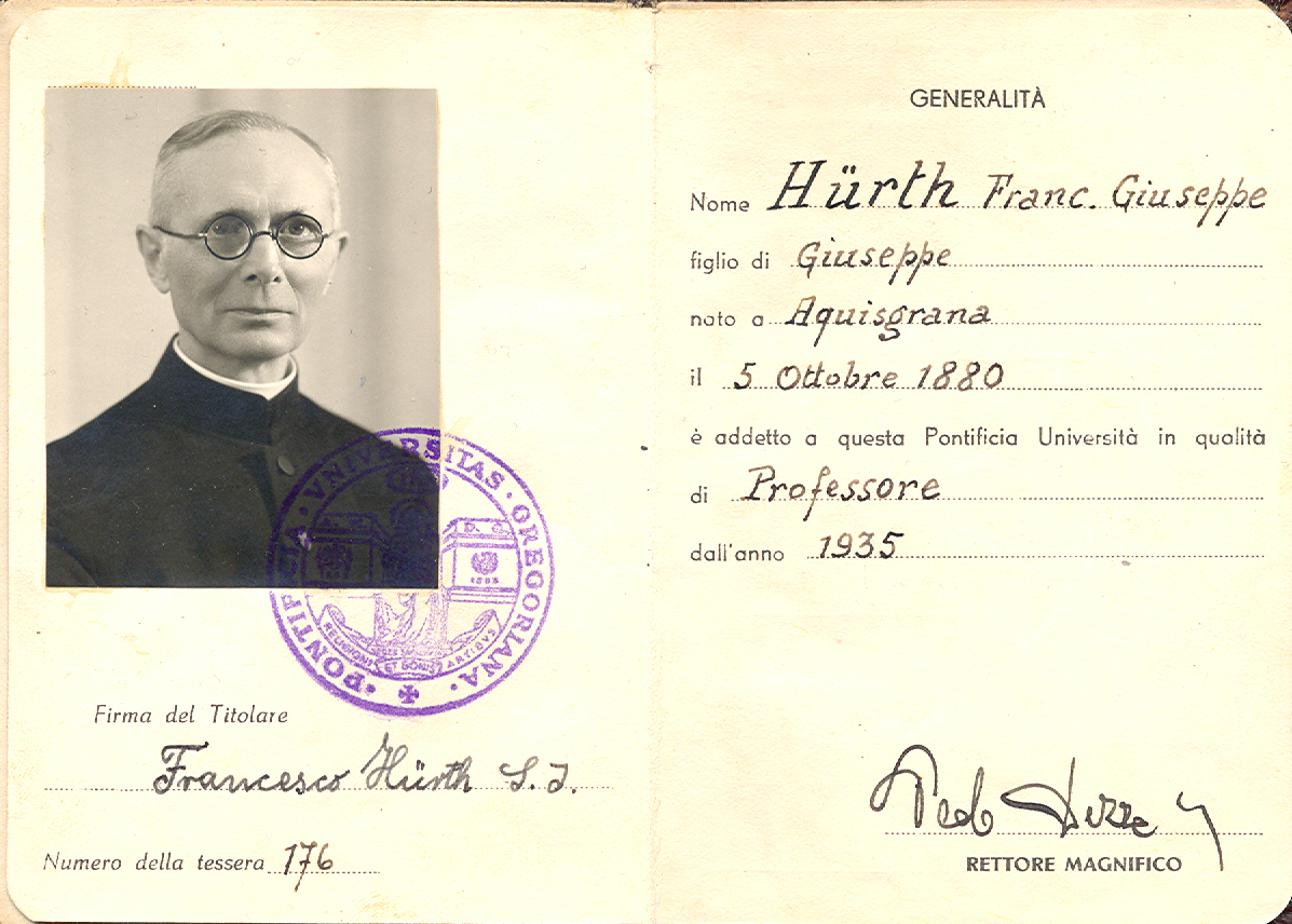 Nonostante o forse proprio a causa della nostra vicinanza cronologica, abbiamo a disposizione poche notizie precise sulla vita del teologo tedesco Franz-Xavier Hürth. Le voci dei dizionari biografici sono scarne. Il fondo conservato presso l’Archivio Storico della Pontificia Università Gregoriana permette invece una ricostruzione articolata del suo profilo a partire dal 1899. Il fondo consta di numerosi manoscritti, dattiloscritti e documenti personali, tra cui foto e una fitta corrispondenza con la famiglia e con altri membri dell’ordine. Come gran parte dei fondi risalenti all’epoca contemporanea anche quello di Hürth non è ancora stato inventariato. Grazie all’accesso che mi è stato generosamente concesso dal direttore, P. Martin M. Morales SJ, e all’aiuto che mi è stato dato da Irene Pedretti e Cristina Berna, mi sono potuta occupare personalmente di una schedatura preliminare dei faldoni.
