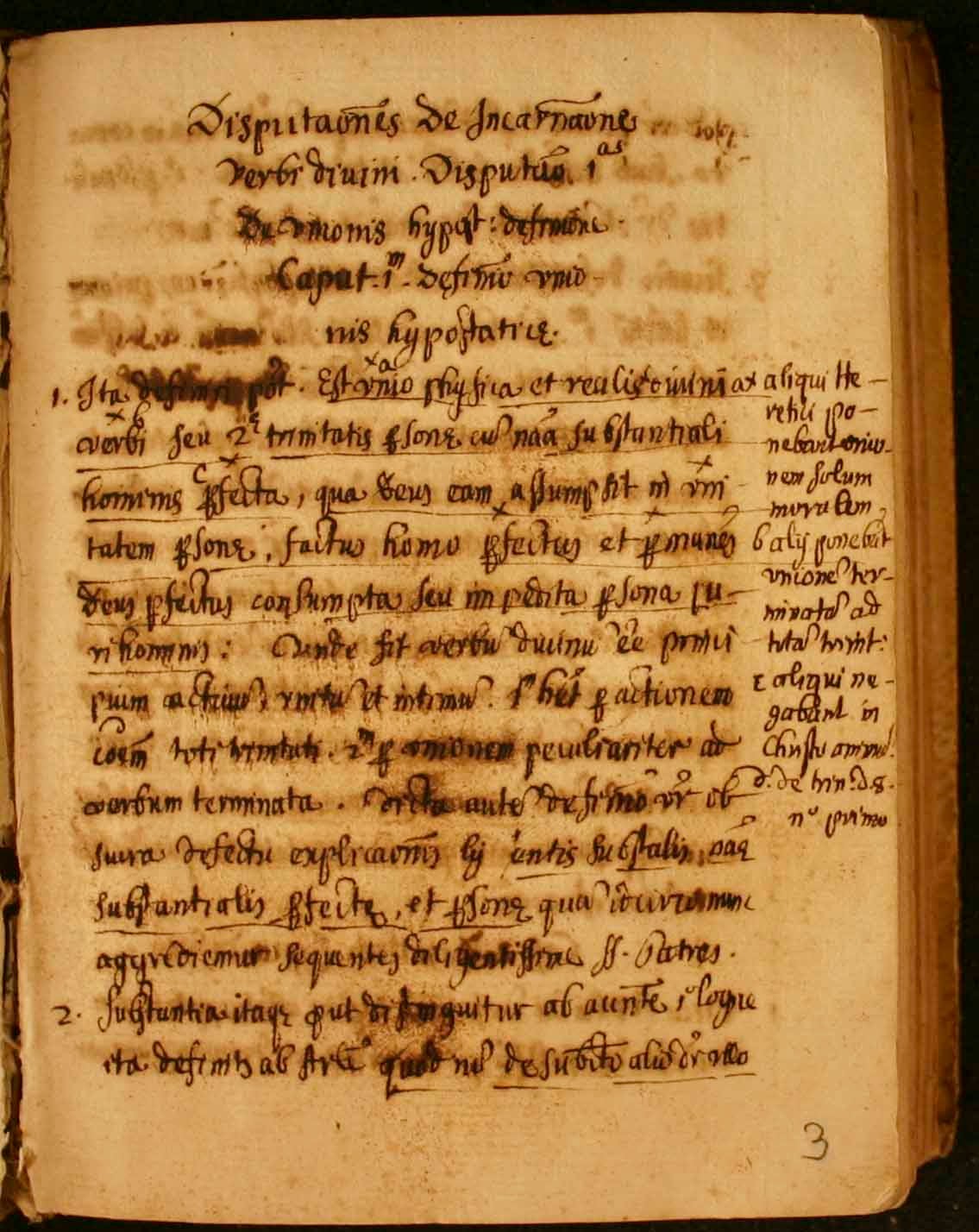 Il titolo della disputazione nell’edizione a stampa è lievemente diverso: «Utrum possit demonstrari ratione naturali, aut evidenti Deum existere, et utrum sit nobis notum per se». Nell’edizione a stampa la disputazione De Deo uno è suddivisa in otto capitoli. Come si può notare, invece, la versione manoscritta contiene soltanto sette capitoli. La discrepanza tra il manoscritto e l’edizione a stampa inizia al f. 35 (p. 6b dell’edizione a stampa), laddove la frase «Deducitur ex dictis explicatio coeterorum terminorum definitionis, seu quasi definitioni Dei» è stata utilizzata come titolo introduttivo di un ulteriore capitolo, rispetto a quelli previsti dal copista.