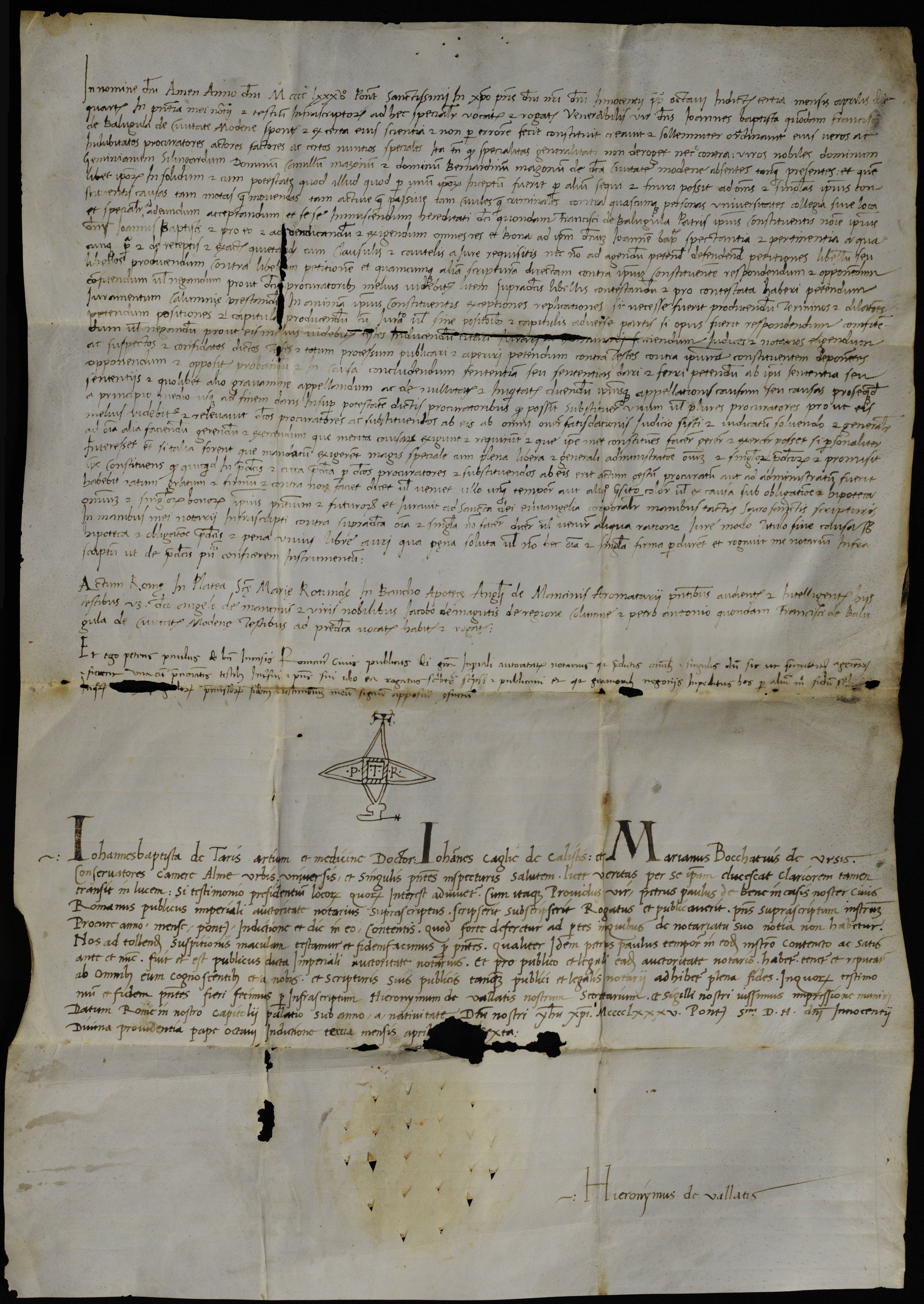 Preliminare alla catalogazione è stata l’attribuzione di una segnatura ai documenti, dei quali già ad un primo spoglio è stato possibile evidenziare l’estrema varietà: le prime 38 occorrenze (Diplomatico 1-33) riguardano documenti che ad una prima analisi (ancorché superficiale) appaiono originali, ordinati in progressione cronologica per un periodo complessivo che va dal 1404 al 1876. Le ultime 17 occorrenze (Diplomatico 34a-42) sono relative a copie, trascrizioni e riassunti di documenti originali, nonché a libelli contenenti il conferimento di titoli e diplomi di dottorato. Si è deciso di accomunare sotto un’unica segnatura i documenti caratterizzati da particolari affinità tematiche (come i diplomi di dottorato emessi dall’Università Gregoriana tra fine ‘800 e inizio ‘900, cfr. Diplomatico 41a-41f) e quelli appartenenti ad uno stesso iter documentario (cfr. ad esempio Diplomatico 17a-17c). Il criterio cronologico è stato reputato l’unico valido, a fronte dell’eterogeneità del materiale conservato, per forma, funzione, composizione materiale: sono presenti documenti pubblici e privati, laici ed ecclesiastici, cartacei e membranacei, più o meno decorati. In molti casi non ci sono tracce che aiutino a spiegare perché i pezzi siano conservati nell’Archivio (esclusi i diplomi di dottorato e un paio di documenti, la documentazione non riguarda direttamente la Societas Iesu), ma per un discreto numero di essi si dispone di brevi regesti approntati dal padre gesuita Paulius Rabikauskas (1920-1998), docente di diplomatica presso l’Università Gregoriana. L’ipotesi più probabile è che questo materiale sia stato adoperato come supporto alle lezioni dei docenti di diplomatica di questa università, e sia quindi confluito (come molto altro materiale accademico) nell’Archivio.