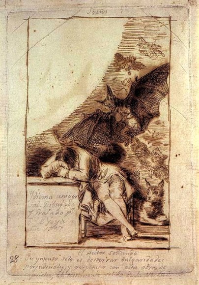 Concludo con un stupefacente disegno preparatorio di Goya. Non lo conoscevo e l’ho trovato sul web cercando l’incisione a me nota. Lo trovo di una grande potenza simbolica come monito perché la battaglia dell’intelligenza ci consenta di non essere sopraffatti dai mostri da noi stessi creati.