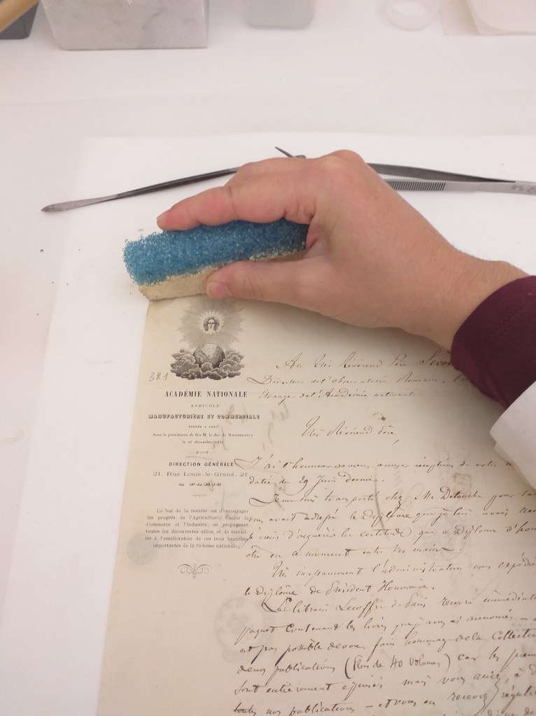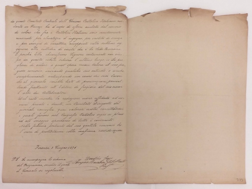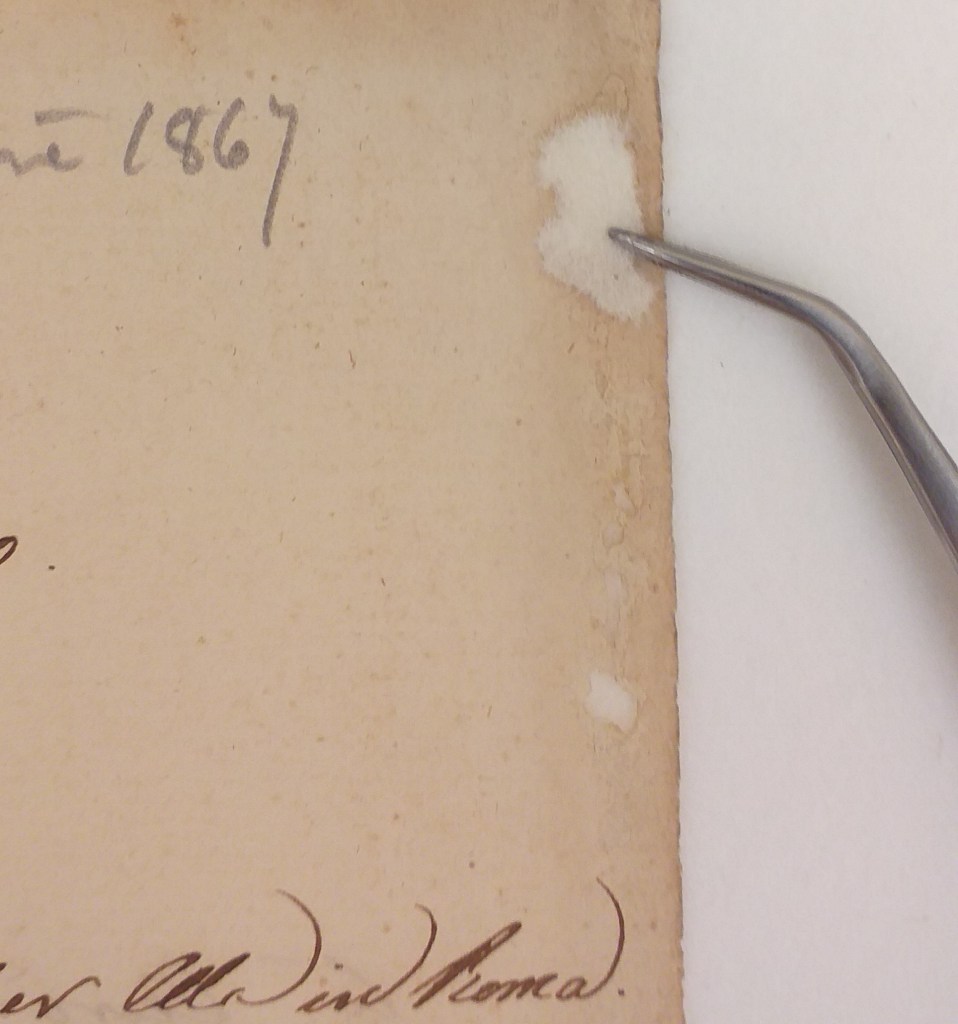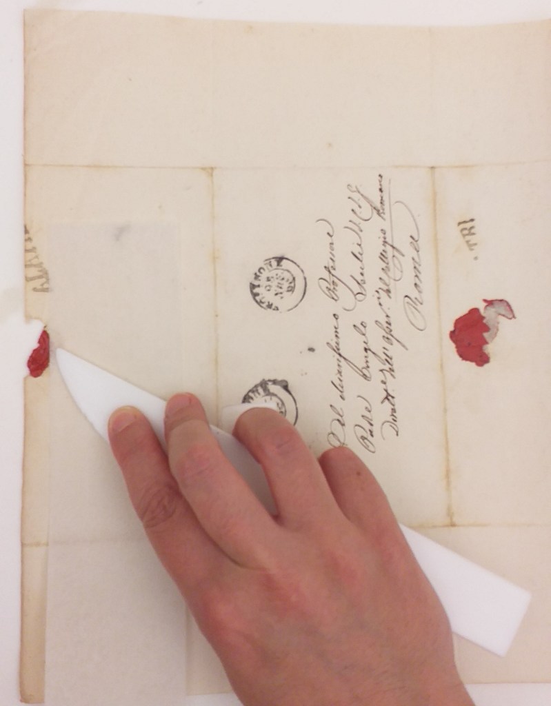 La corrispondenza è una tipologia di materiale che ad un osservazione superficiale potrebbe sembrare omogenea, senza grandi problemi di conservazione e restauro: sono solo carte sciolte. Se certamente non vi sono i problemi del materiale rilegato e cucito questi documenti presentano problematiche legate al formato, al materiale e alle condizioni in cui è stato conservato. Trovandosi in ordine alfabetico di mittente si trovano biglietti da visita su cartoncini spessi mischiati a carte di grande formato, fino a carte veline sottilissime come quelle inviate da Santiago del Cile da P. Enrico Cappelletti. La disposizione in buste, scatole e casse e i diversi trasferimenti erano visibili sui documenti osservando una serie di danni.