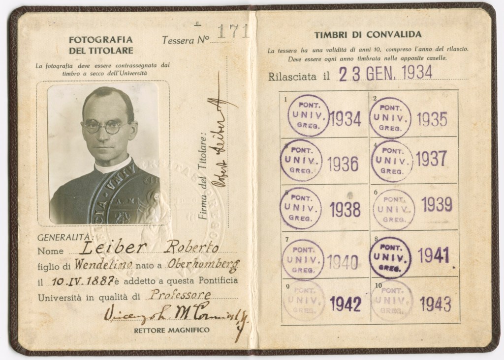 Inutile sottolineare l’importanza di questo materiale per uno studio del posizionamento della Chiesa (e della Compagnia di Gesù, in particolare) nei confronti della persecuzione e dello sterminio ebrei, nonché delle strategie adottate per rispondere alle accuse che venivano mosse, in quegli anni, alla figura e all’operato di Pio XII. Tuttavia, il Fondo Leiber – come ogni documentazione poco studiata – non offre solo risposte alle vecchie domande, ma è in grado, se solo si voglia esaminarlo nella sua interezza, di generare domande nuove. E la figura sfuggente del segretario particolare di Pacelli – l’Archivio ci restituisce, attraverso una fototessera (fig.1), un’unica immagine dell’uomo – attende ancora di essere messa a fuoco dagli studiosi.
