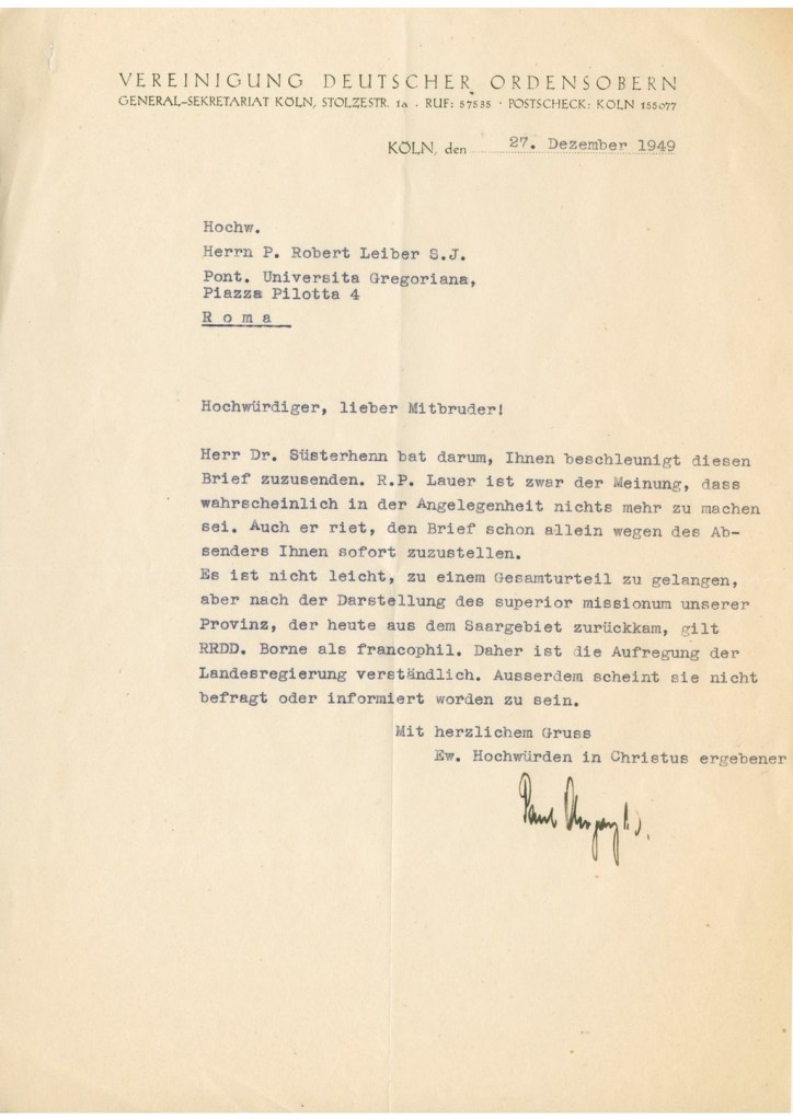 La lettera (disponibile il documento integrale in GATE a questo link) fu inoltrata a Leiber dal segretario generale dell’Unione tedesca dei superiori degli ordini: “R. P. Lauer è convinto che verosimilmente, date le circostanze, non ci sia nulla da fare”. In ogni caso, aggiungeva l’estensore nel biglietto – non sono riuscito a identificare la firma – l’agitazione del governo regionale è “comprensibile”.