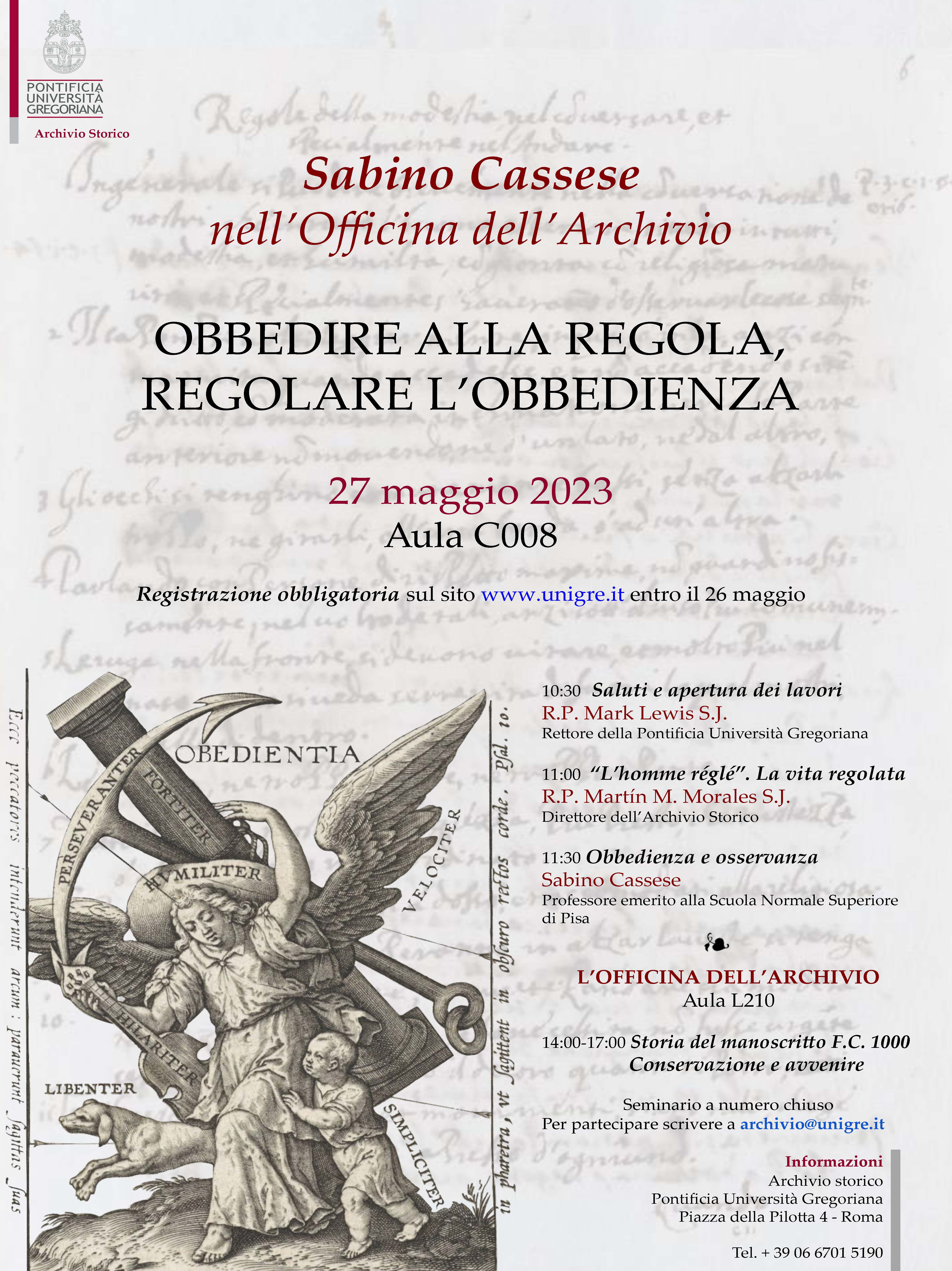 Il 27 maggio prossimo avrà luogo il secondo incontro delle Officine dell’Archivio. Con l’occasione del processo di valorizzazione del codice F.C. 1000, è stato invitato il prof. Sabino Cassese ad illustrare il rapporto tra obbedienza e osservanza. Si tratta di una fonte tra le più antiche conservate nell’archivio dell’Università. Contiene una miscellanea inedita di testi manoscritti e a stampa. Probabilmente realizzato nella cerchia di san Francisco Borgia, documenta la lenta gestazione che porterà alla pubblicazione di tutta una serie di apparati normativi che hanno caratterizzato la Compagnia di Gesù.