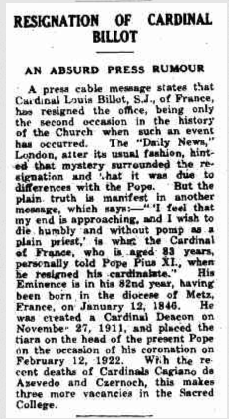 Così il Card. Pietro Gasparri, per conto della Segreteria di Stato, scriveva al Card. Billot. Era il 12 agosto 1927. Lo scandalo suscitato dalle dimissioni di Billot – che nulla hanno a che vedere con il precedente del cardinale Carlo Odescalchi SJ (1785-1841) (ritiratosi per malattia), citato nella lettera – esplose nel settembre successivo, come si evince dall’articolo del Popolo di Roma conservato fra carte del cardinale. Al centro, com’è noto, lo scontro durissimo tra Pio XI e Billot intorno alla condanna dell’Action Française. Il 13 settembre, il secondo scriveva così al P. Domenico Palermo Lazzarin1i: