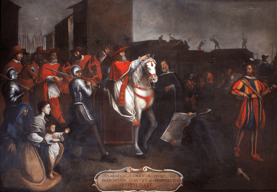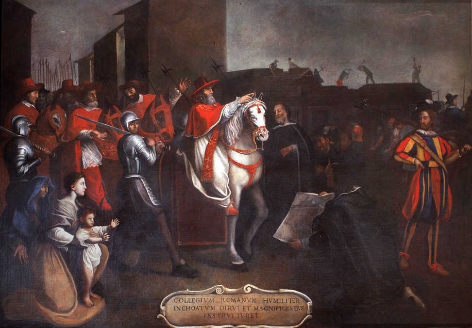 Al secondo piano del palazzo centrale dell’Università Gregoriana un dipinto (192×282 cm) di autore anonimo (1655), fino al 1870 nella sua sede al Collegio Romano, mescola finzione e realtà e raffigura una scena inusuale. Al centro dell’opera, possiamo osservare papa Gregorio XIII, su un destriero bianco, mentre si avvicina al Collegio Romano. Sullo sfondo, nell’alto di un muro un gruppo di uomini esegue l’ordine del papa fondatore, di demolire per ricostruire un edificio degno del suo patrocinio.