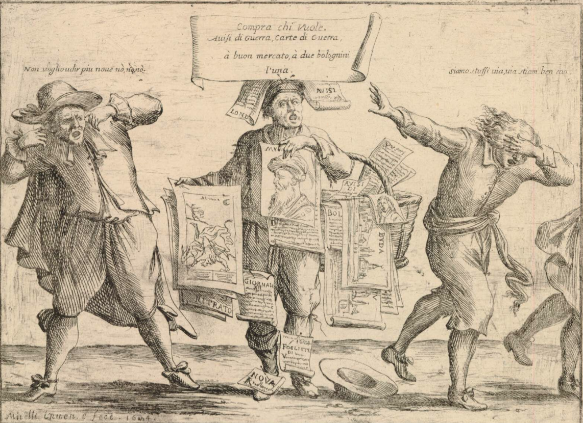 Tra le celebre incisioni di Giuseppe Maria Mitelli (1634-1718) alcune sono dedicate alle notizie di guerra. In una di queste (1684), un gazzettiere, sovraccarico di fogli volanti, cammina sventolando foglietti, avvisi e nove, molte di essi relativi alle guerre in corso.