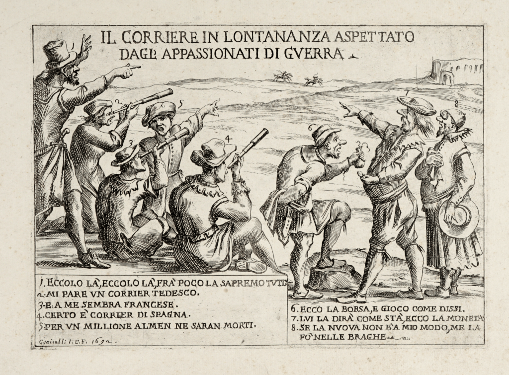 Tra le incisioni del Mitelli, ne troviamo un’altra dove si vede un gruppo di uomini che innanzi all’imminenza della notizia reagisco in modo diverso. Ci sono gli “appassionati di guerra” che, cannocchiali in mano, sperano con ansia di sapere da quale fronte di guerra arrivano le nove e quanti saranno morti. Un’altro si abbandona al timore di poter ricevere una notizia non desiderata. Per un altro ancora, l’arrivo del corriere è un’opportunità per lanciare una scommessa. Potrebbe essere questo anche un modo di difendersi dall’incalzare della novità: ricondurla a un gioco, fissando l’attenzione sul messaggero più che sul contenuto del messaggio, diminuendo così la drammaticità e levando importanza alla nuova. Il sistema dell’informazione, se lo si osserva con attenzione, dimostra da sé tutta la sua fragilità senza però diminuire la sua efficacia: Il gazzettiere si corica tranquillo a sera con una notizia che, alteratasi nella notte, è costretto ad abbandonare al suo risveglio2.