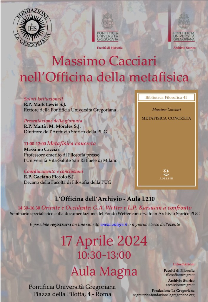 Dopo gli incontri con Carlo Ginzburg, Sabino Cassese e Luisa Ciammitti, le “Officine” dell’Archivio Storico della Gregoriana ospiteranno Massimo Cacciari per parlare del suo ultimo libro e per intavolare un dialogo – nello spirito delle precedenti iniziative – che metta a confronto la voce di un grande interprete contemporaneo con quelle del passato, grazie a fondi archivistici inediti. La seconda parte della giornata sarà infatti dedicata al Fondo Wetter e alla presentazione della corrispondenza tra P. Gustav Wetter SJ (1911-1991), futuro direttore del Pontificio Collegium Russicum, con il filosofo russo Lev Karsavin (1882-1952), pensatore vicino a Pavel Aleksandrovič Florenskij e al tempo stesso originalissimo; riscoperto, in Russia, solo dopo la fine dell’Unione Sovietica. Vedremo che al centro di questo fitto scambio di lettere, ancora inedito in Italia, è lo stesso problema che occupa le ultime riflessioni di Cacciari: la realtà concreta della metafisica.