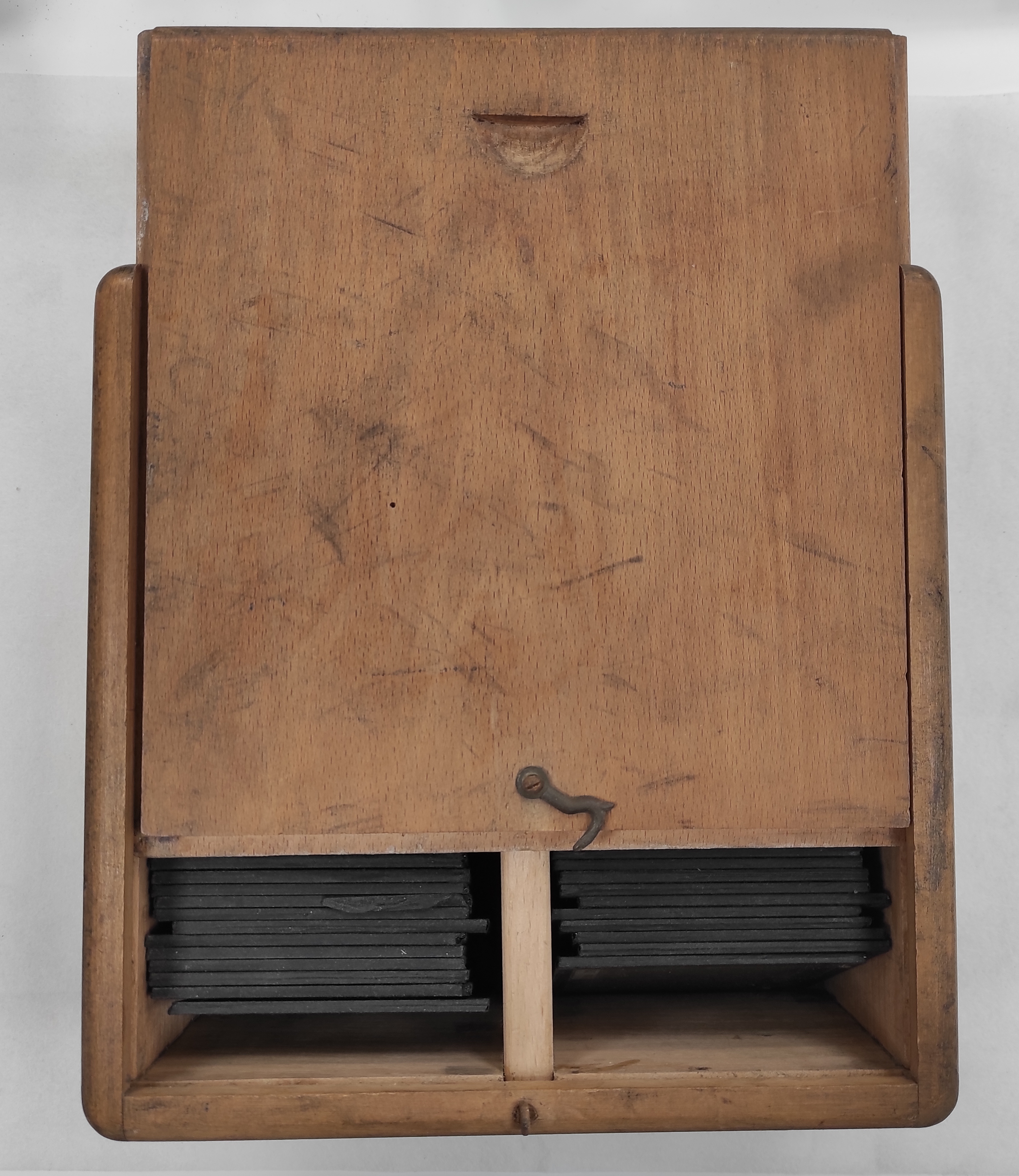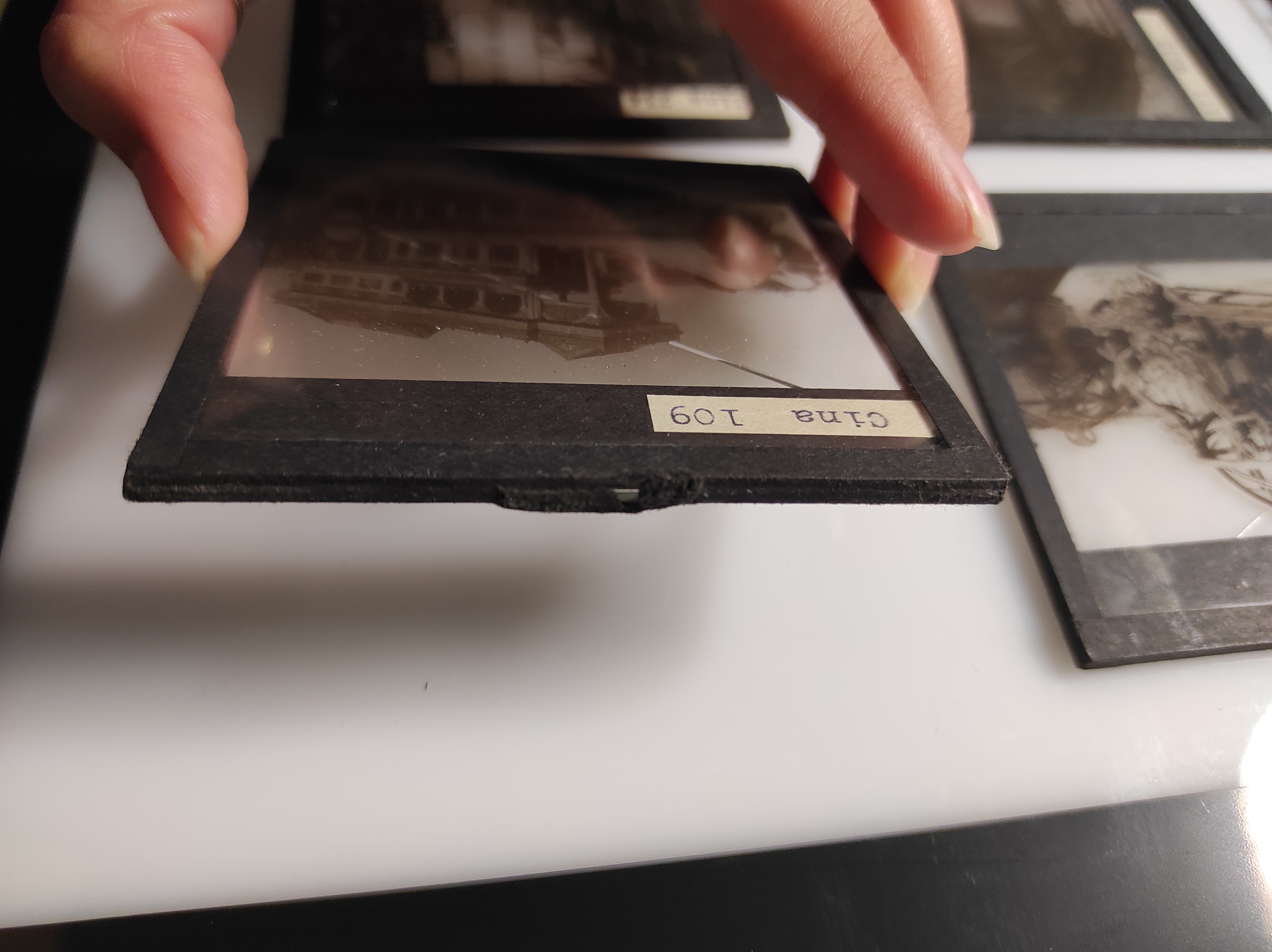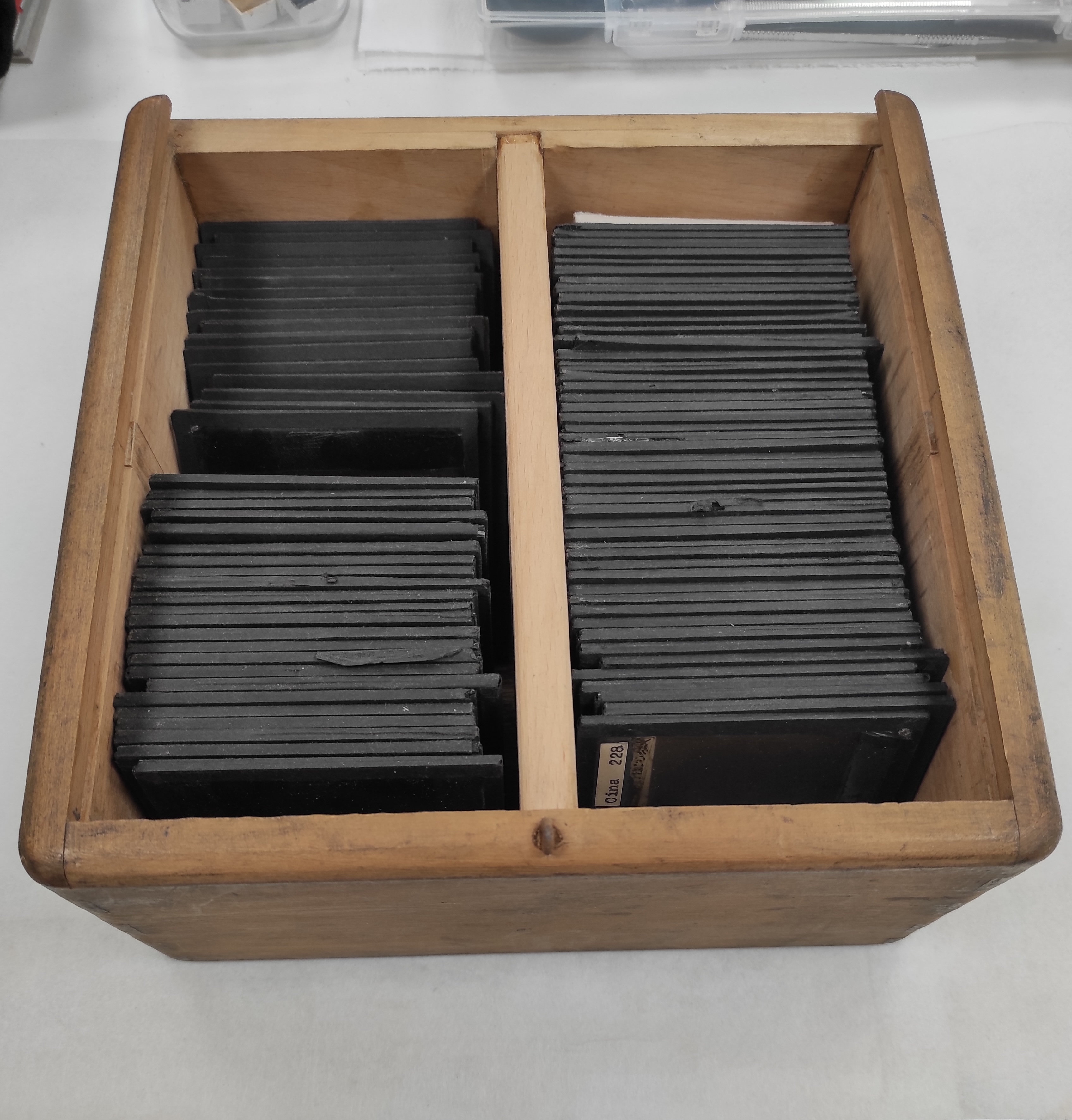 - Condizionamento all’ interno di una scatola in cartoncino idoneo alla conservazione testato PAT. La scatola alloggerà le diapositive verticalmente, tranne per le lastre gravemente danneggiate, che verranno posizionate orizzontalmente.