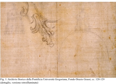 All’interno del fondo Orazio Grassi, presso l’Archivio Storico della PUG, si conservano importanti testimonianze riguardo la sopra descritta cupola, nonché il tiburio e il suo coronamento. Si sta facendo riferimento alle cc. 36, 100 e 148, già individuate da R.Bosel[2] all’atto dei suoi studi del 2004, le quali raffigurano, rispettivamente, la pianta di un quarto del tamburo della cupola e la sua sezione, un abbozzo di diverse soluzioni di coronamento e uno studio per il tiburio.