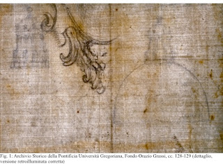Quindi, il fondo Borromini all’Albertina di Vienna (Az. Rom. ff. 492-495), all’interno del quale si trovano conservati tre fogli, apparentemente ricalcati dall’architetto dagli originali del Grassi. In uno di questi (ff. 492 e 495), risulta una proposta alternativa per il coronamento del lanternino in forma di obelisco. Nel codice Spada, la soluzione con l’obelisco risulta direttamente delineata sul f.116, mentre la copertura a cupolino è presente, in qualità di variante al progetto, su una lingua di carta incollata al foglio. L’obelisco, coronato da un emblema dell’ordine, risulta in proposito analogo ad una incisione di Daniel Widman, inclusa nell’opera “Rosa Ursina” dell’astronomo gesuita C. Schneider S.J., dove un disco perforato con il monogramma IHS, situato sopra la guglia, viene usato come schermo ottico per l’osservazione dei raggi solari.