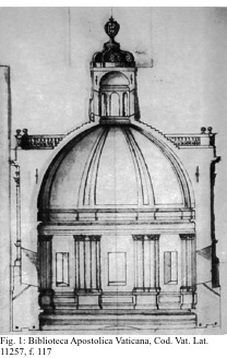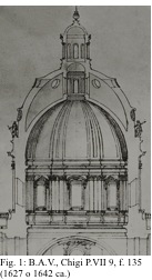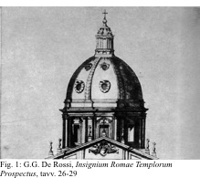 Infine le tavv. 26-29 realizzate da G.G. De Rossi in “Insignium Romae Templorum Prospectus” in data 1683[1], laddove la cupola è coronata dal globo e presenta unicamente delle piccole volute di raccordo tra quest’ultimo e il lanternino.