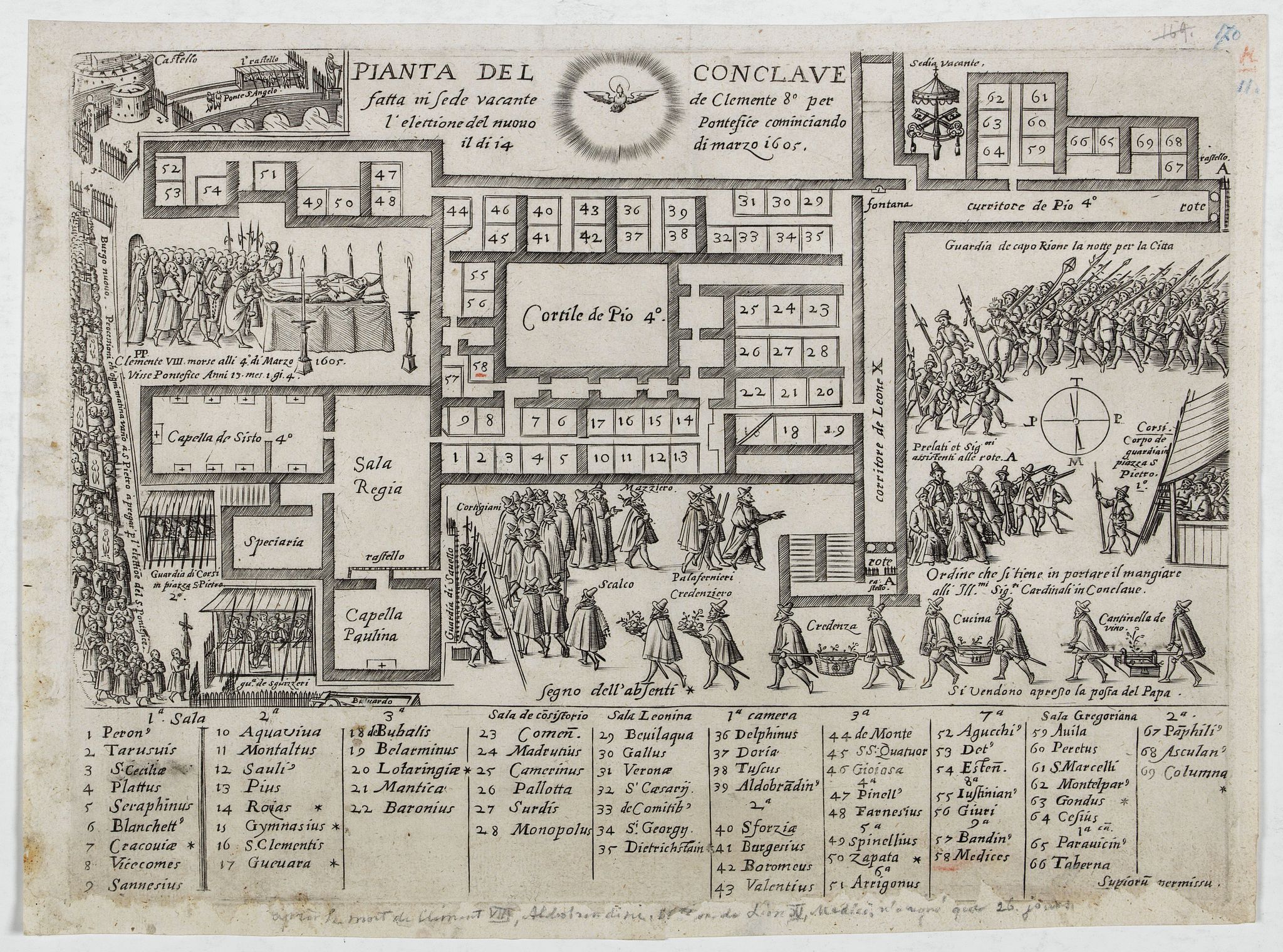 Una delle versioni del conclave in cui venne eletto Gregorio XV può essere utile per stabilire delle differenze. Il periodo di sede vacante apriva, per tutta la città di Roma, un tempo di disordine e sconcerto. La città era un’altra; al punto tale che, come dice l’anonimo “conclavista”, chi non è stato a Roma in tempo di sede vacante non ha conosciuto veramente la città. La Roma “vera” implicava l’esperienza del governo del Papa e il suo contrario. Erano da temersi i lunghi conclavi. Si fermava la giustizia, si cambiavano a volontà i prezzi delle merci, perfino la gente parlava liberamente, si rivelavano segreti, finiva la cortigiana adulatione che si disponeva a rivolgersi altrove. Si esacerbavano le fazioni cardinalizie, così come le tensioni tra gli ambasciatori presenti alla corte pontificia, si riaprivano le faide tra le famiglie nobiliari.