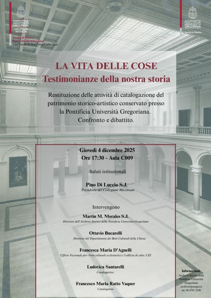 La storia della Pontificia Università Gregoriana può essere raccontata in molti modi: attraverso i documenti, la produzione accademica che l’ha accompagnata lungo i secoli, la rete dei suoi ex-alunni che ne hanno diffuso l’influenza nel mondo. Ma può essere narrata anche attraverso il suo patrimonio: osservando nelle cose le tracce delle generazioni passate. Lo stato di conservazione del suo patrimonio è lo specchio di quanto — e di come — essa creda e costruisca il proprio futuro. Ogni scelta di cura, di tutela o di abbandono parla del modo in cui una comunità percepisce la propria continuità nel tempo. In questo quadro, il prossimo 4 dicembre (aula C009, ore 17:30) sarà presentata la prima restituzione del lavoro di catalogazione del patrimonio custodito all’interno del Collegium Maximum: un passo essenziale per riconoscere, comprendere e valorizzare la memoria materiale che sostiene la nostra storia e, con essa, la possibilità stessa di costruire futuro.