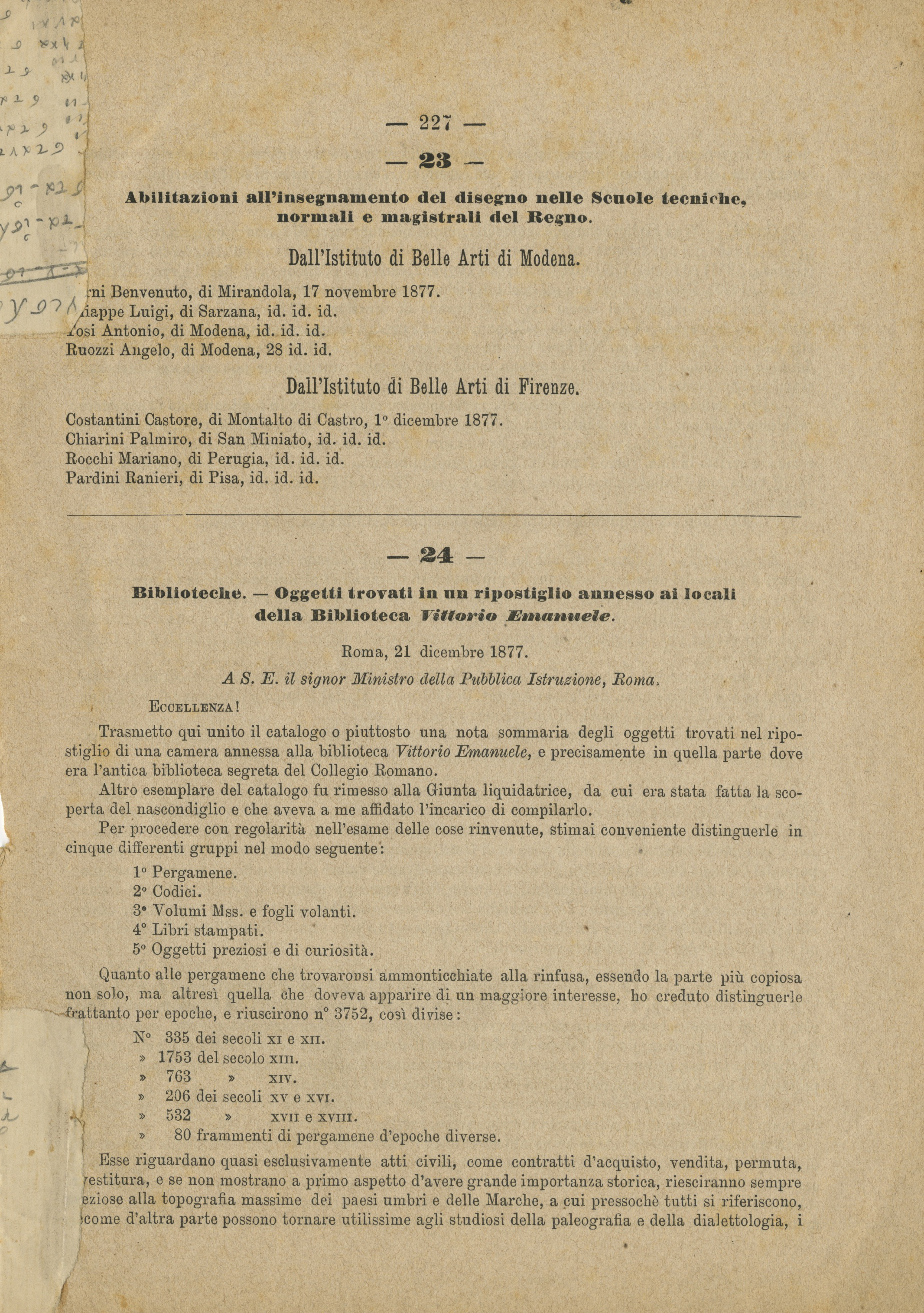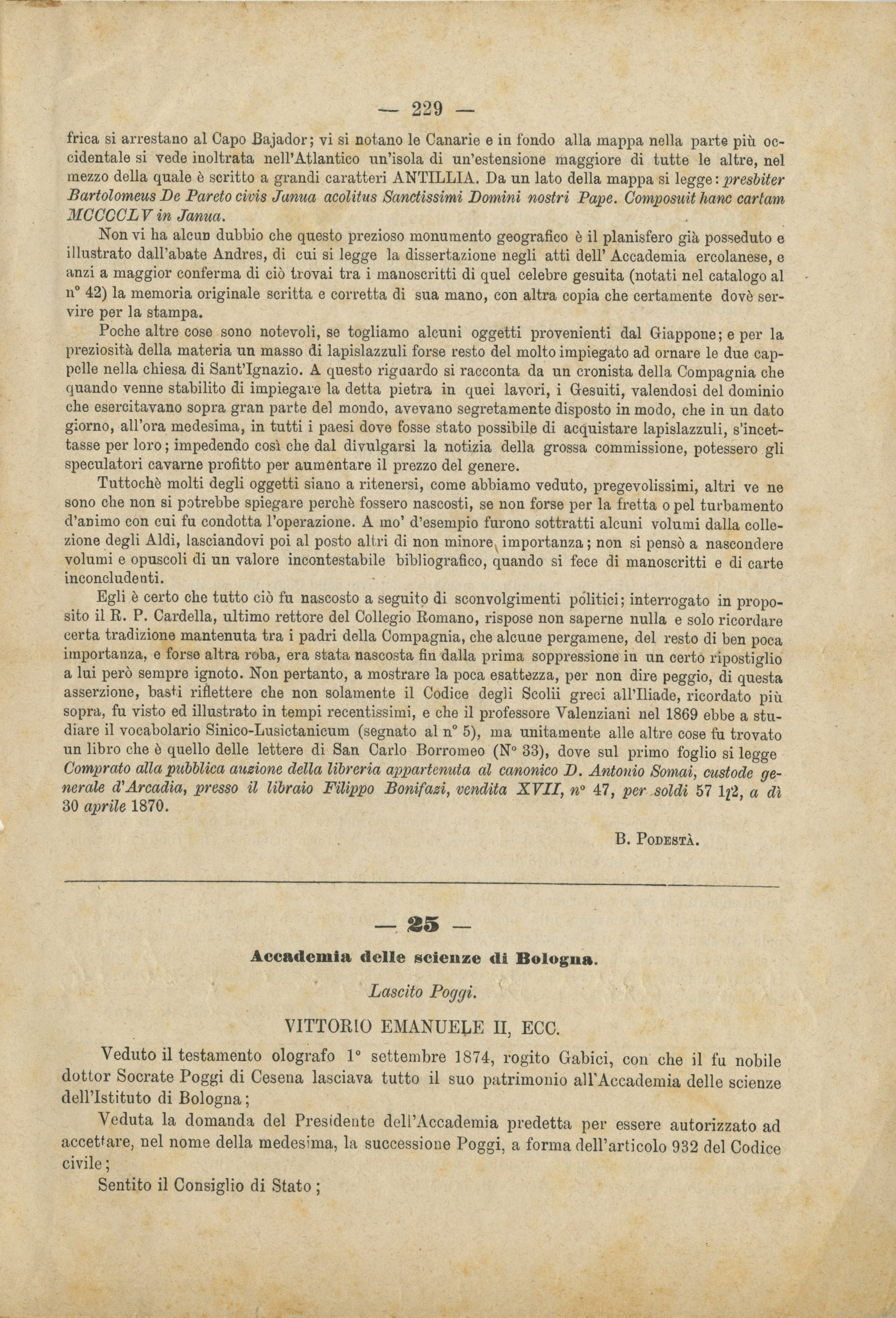 In seguito alla denuncia nel 1877 di Bartolomeo Podestà effettuata in seguito alla legge di soppressione delle Corporazioni religiose di Roma apprendiamo del ritrovamento, di questo ripostiglio, possiamo individuare parti di fondi che oggi fanno parte, nuovamente, dell’Archivio della PUG: