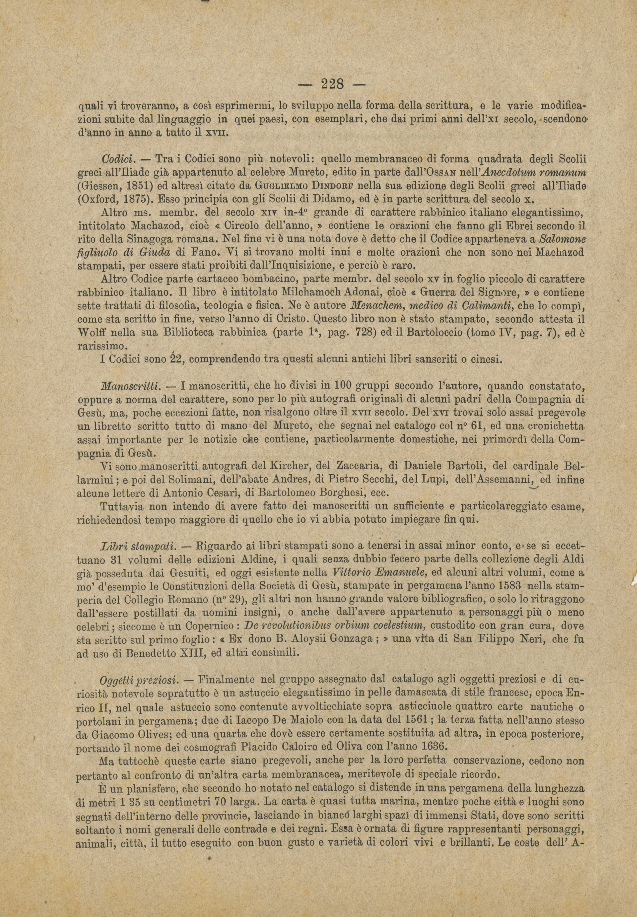 Mentre si hanno notizie dettagliate della Bibliotecha maior e se ne conserva il catalogo settecentesco (12 volumi in folio, collocato presso la BNCR) non si è a conoscenza dell’esistenza di un catalogo relativo alle biblioteche minori sebbene l’urgente necessità di compilarlo fece includere nell’accordo del 1694 tra il Procuratore del Collegio e il Prefetto della biblioteca la seguente nota: “Finito l’indice della libreria secreta, che hora si fa, si faccia l’istesso della libreria commune, e poi di tutti li libri, che si sono sparsi per le camere, aggiongendo à quelli che non l’hanno, l’inscritione, et applicatione, cioè Collegio Romani Societatis Jesu inscriptus cathalogo.”Se in seguito alla soppressione della Compagnia di Gesù del 1773 la Biblioteca, pare essere rimasta inalterata fino al ritorno nel 1824, alcuni manoscritti insieme a codici, libri rari ed oggetti preziosi furono murati in un ripostiglio di cui, durante il secolo successivo si conservò solo un vago ricordo. Infatti la sua collocazione, probabilmente, era nota soltanto al P. Prefetto e al Fr. Custode. “Questo ripostiglio era una specie di deposito di materiale di un certo pregio, ma non ordinato, non classificato, non catalogato perché potesse essere agevolmente consultato e studiato […] e date queste sue condizioni esso pare non fosse accessibile, in via ordinaria ai professori del Collegio per il loro lavoro” .[C. BIZZOCCHI, Il “ripostiglio” della Biblioteca del Collegio Romano in “Gesuiti della Provincia Romana”, 2 (1971), p. 20] Con l’emanazione della legge di soppressione delle Corporazioni religiose del 19 giugno 1873 iniziò l’incameramento dei beni delle biblioteche dei diversi ordini religiosi. E’ da segnalare come in quella data il patrimonio del Collegio Romano risultasse intorno ai trentamila volumi , quindi molti meno rispetto a valutazioni di poco più antiche.